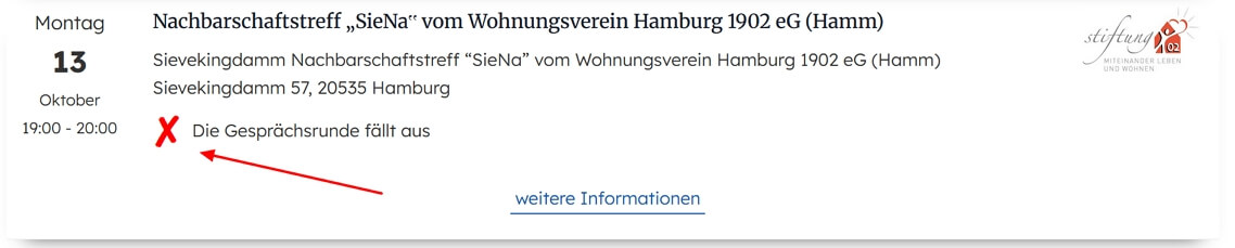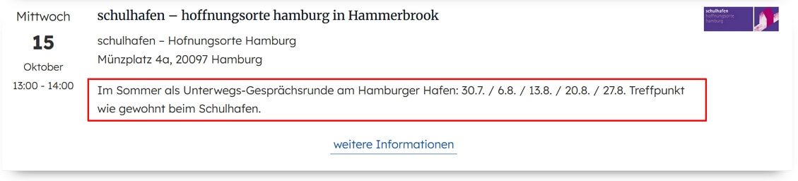 Da der Ausfall einzelner Termine durch die Terminausnahmen geregelt werden können. Besteht hier die Möglichkeit, generelle Hinweise zu platzieren. Z.B. „Während der Weihnachtsferien findet keine Online-Gesprächsrunde statt”. - Auf der Terminkalender-Seite